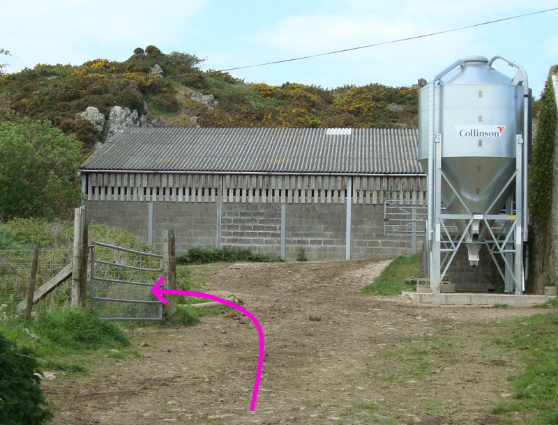 Follow this path up. When it reaches a gravel track, go straight across up the unmarked path, ignoring the sign to the right. At a farmyard, turn left through the metal gate: