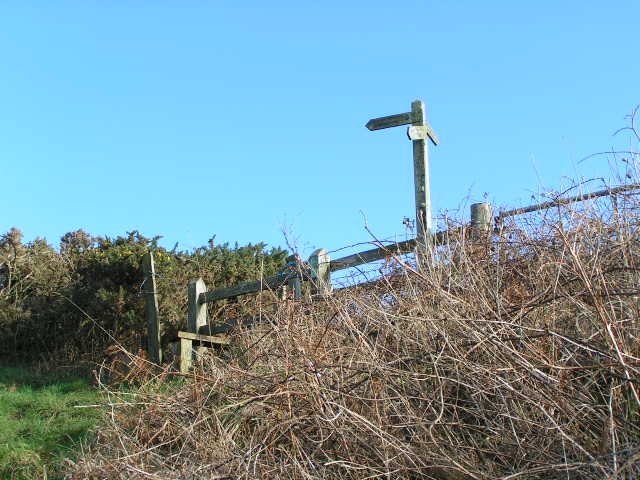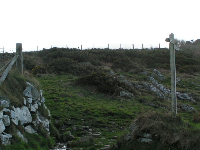 From the coast path walking East: after passing Carregwastad Point, the coast path descends to the wooded valley of Cwm Felin. When you come up out of the valley, there's this signpost by a stile and gate (click to enlarge):